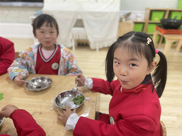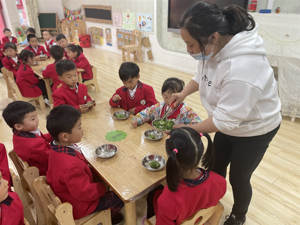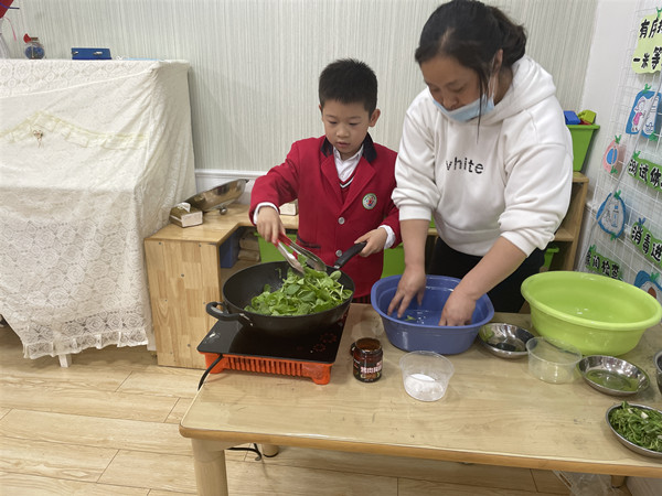 接下来,老师开始大显身手啦!小朋友也想体检一下炒菜。哇,绿油油的菜出锅咯!“好香呀,我想吃!”孩子们开心地说。大家都迫不及待了,都想尝尝这“与众不同”的菜。