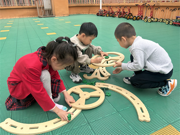 在老师的支持下,孩子们找了很多螺母搭建的操作图,大家分工合作,在积木搭建探索的过程中大胆尝试。孩子们在搭建和组装的过程中,相互探讨,共同解决困难。伙伴之间相互合作、共同协商的游戏方式,让孩子们觉得拼搭螺母积木简单而有趣。