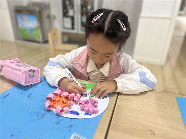 欣赏完菊花后,教师及时抓住孩子的兴趣,带着孩子们一起用制作手工的方式来记录下美丽的菊花,孩子们根据菊花的特征,按照步骤,将彩纸剪成纸条,然后一层一层的粘贴到一起,最后用画笔画上叶子,一朵朵美丽的菊花在孩子们的巧手下栩栩生辉、美不胜收。