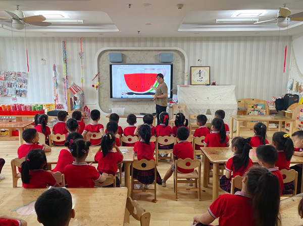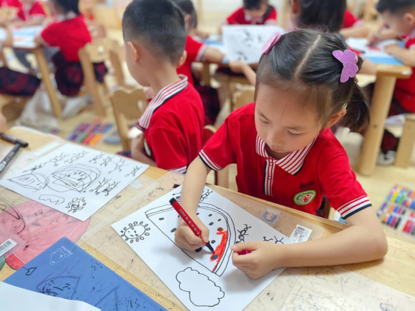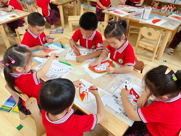 《蚂蚁和西瓜》美术活动结合绘本的游戏情境,基于幼儿对动物形态有较强表达欲望的特点而设计,意在调动幼儿已有的生活经验,引导幼儿在游戏中创造表现蚂蚁的不同动态。在创作中,小朋友们设计出的西瓜形状丰富多彩。在色彩表现上,合理运用对比色,使画面色彩生动鲜明、富有美感。小朋友们还对零散的西瓜块及搬西瓜的蚂蚁进行了完美的装饰,整幅画面色彩鲜艳、充满了强烈的装饰美感。