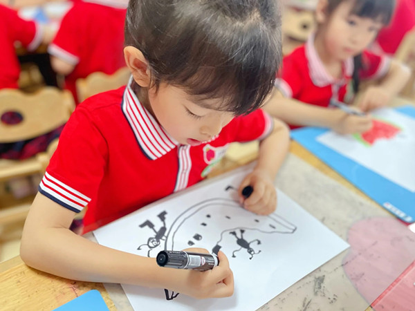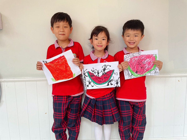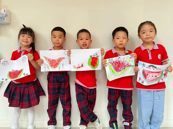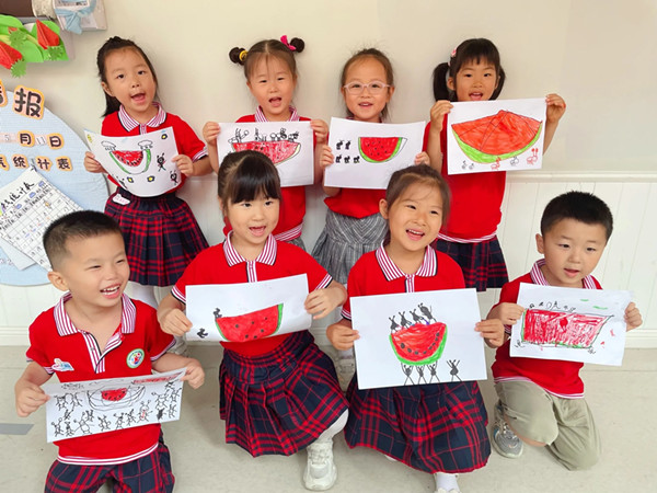 《蚂蚁和西瓜》美术活动的开展既让孩子们在绘本中感受了故事的有趣,又让孩子们在艺术创作中感受到了色彩的冲击和创意绘画带给我们的乐趣!以绘本为依托、充分挖掘绘本中的文化元素、美术元素,引导幼儿从绘本角色的色彩、造型、动态等方面进行感知与欣赏,鼓励幼儿通过尽情畅想、创作小蚂蚁的团队故事,体验表现和创造的乐趣。