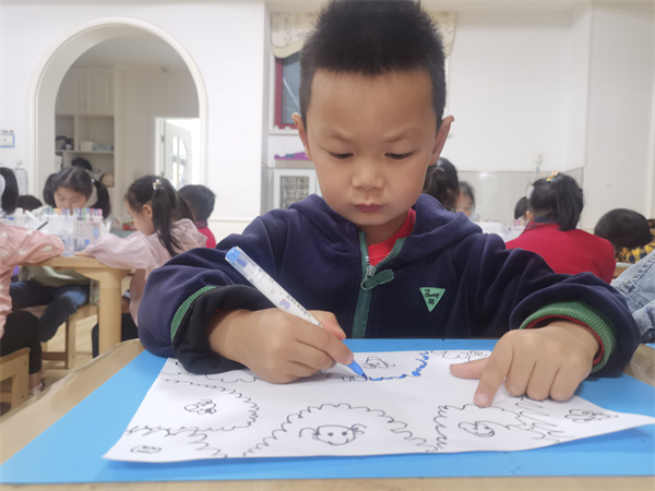 首先老师详细地讲解了绘画的基本步骤、色彩搭配、绘画技巧等。比如小羊身上的羊毛可以用线条密密的绕圈圈,勾勒线条,用粗笔描边边。