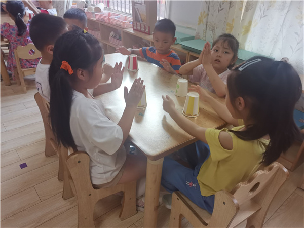 老师根据幼儿的年龄特点以及发展水平,精心选择音乐,编排适宜的动作,孩子们在节奏鲜明、欢乐的音乐中大胆表现。随着充满趣味的律动音乐响起,大四班的小朋友们或挥动手臂,或击掌,或敲打杯子,小朋友们的双手有节奏的拍击摆动,动作整齐划一,自信阳光洋溢在他们的脸上。