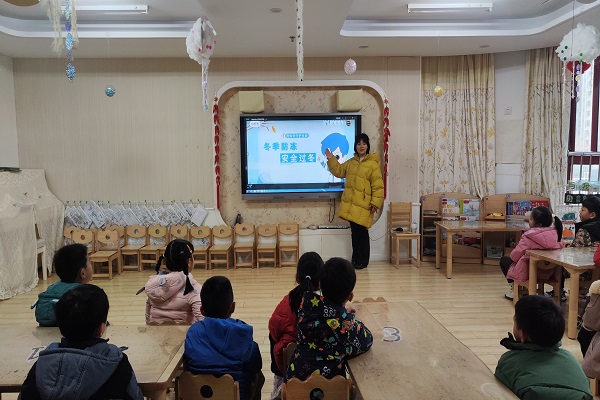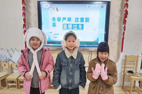 大八班的老师以PPT、视频、图片讲解等形式进行防寒保暖教育。孩子们不仅了解了一些冬季防寒保暖的小常识,也在实践中学会了如何防寒保暖。
