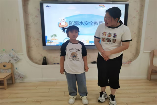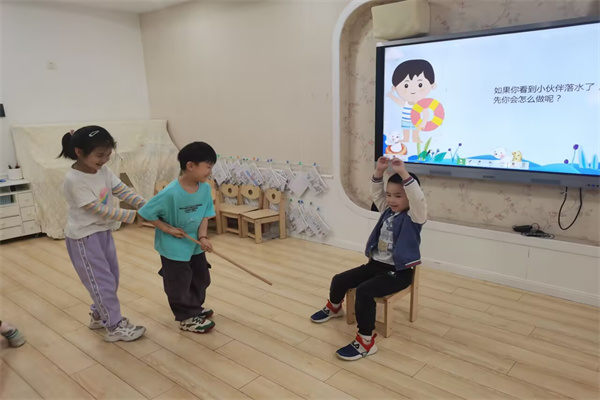 接着教师通过引导式提问,如“哪些地方容易溺水?”“遇到危险该怎么办?”,帮助幼儿梳理安全要点,并借助图片、视频直观展示危险水域(池塘、水库、深水区等),强化“远离危险”的认知。最后通过情境演绎帮助幼儿加深印象,幼儿分组扮演“落水者”“救援者”“报警人”,演练正确求救流程,教师现场纠正错误行为(如盲目跳水施救、手拉手救人等危险行为)。