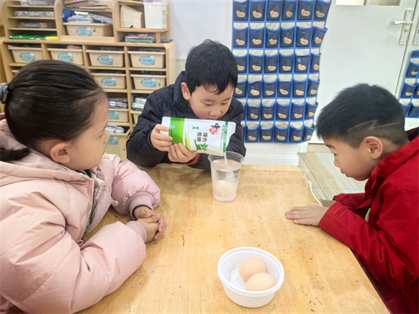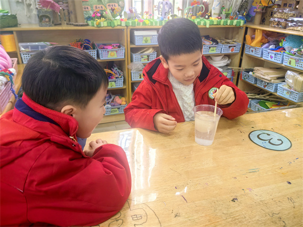“哇!我发现怎么让鸡蛋浮起来了!我加了很多盐!”铭善小朋友兴奋地喊道。原来,随着食盐的加入,水的密度逐渐增大,当食盐水浓度达到一定程度时,原本沉入水底的鸡蛋便摇摇晃晃地浮上了水面。