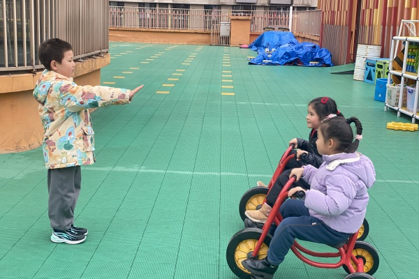 在户外活动时间,孩子们将生活经验和所学的交通安全知识融会贯通,不仅严格遵守交通规则,安全地“驾驶”着玩具车;还亲身体验了交通警察指挥交通、维护秩序的神圣职责,对那些不守规矩的“驾驶员”给予了“处罚”和“警告”,场面既严肃又充满乐趣。