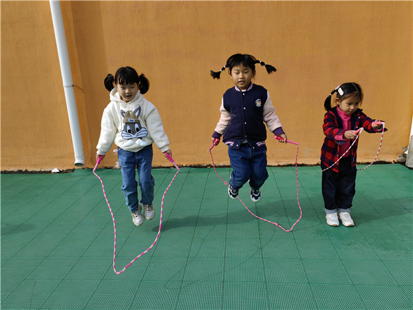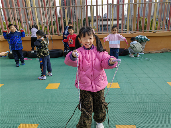 瞧,户外场地上到处活跃着小朋友们跳绳的身影。孩子们精神饱满、自信满满,小小的身躯充满了大大的力量!“1个、2个、3个……我能连着跳10个啦!”“我还会倒着跳呢。”小朋友们相互分享着自己跳绳的进步。
