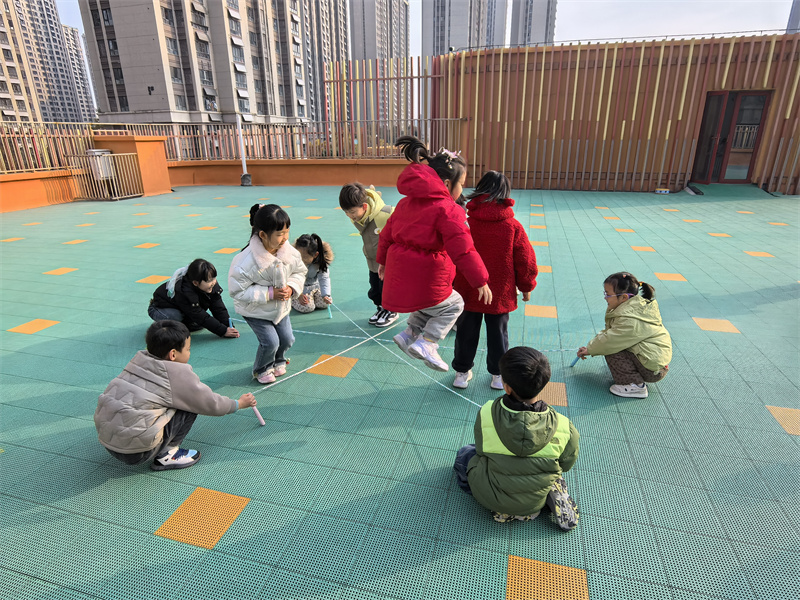 活动中,孩子们创意解锁跳绳的多种玩法:有的组队用绳摆出“跳房子”格子,蹦跳间灵活舒展肢体;有的专注练习单人跳,绳影翻飞中尽显轻巧;还有的玩起了跳绳接龙的游戏;老师参与的“大绳接龙”环节更将氛围推向高潮——孩子们排队跃入绳中,清脆笑声裹着节奏,让运动充满暖意。