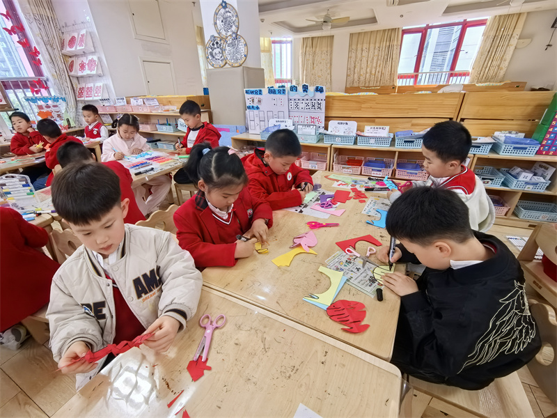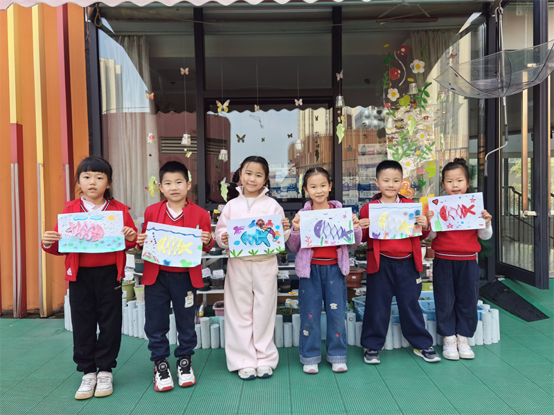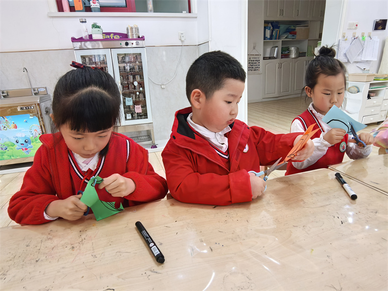 孩子们认真观察、耐心操作,小心翼翼地对折、绘画、裁剪。小小的剪刀在手中灵活穿梭,一张张普通的彩纸,在孩子们的巧手下变成了形态各异的鱼形拉花。有的孩子还自主调整线条、画上不同的装饰,为作品增添了专属创意。完成后,孩子们兴奋地展示作品,互相分享创作思路,活动室里充满了欢声笑语。