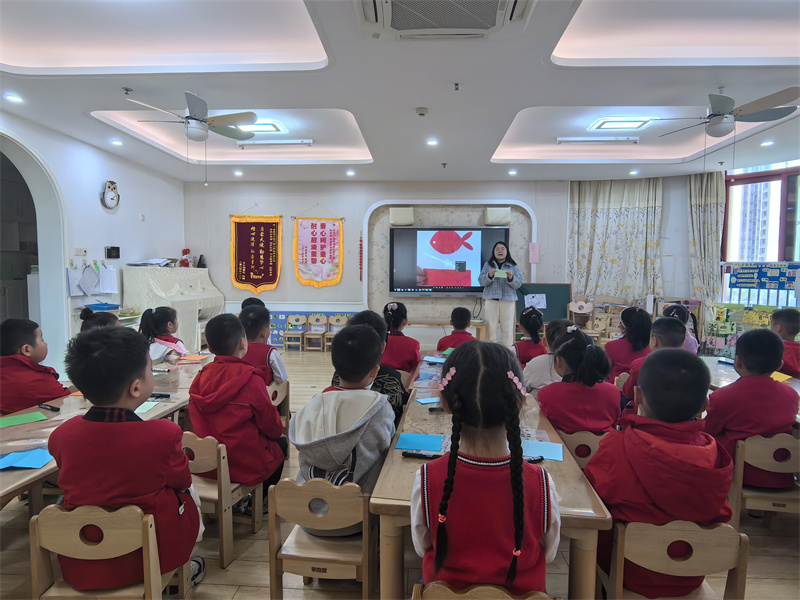 活动中,陆珍老师先向孩子们介绍了剪纸的基本技巧,结合本次“创意拉花鱼”作品,分步讲解了操作步骤:将正方形彩纸对折,勾勒出鱼的轮廓,沿线条剪下外形,再在鱼身剪出交错长条,最后轻轻拉伸,立体灵动的鱼形拉花便制作完成。