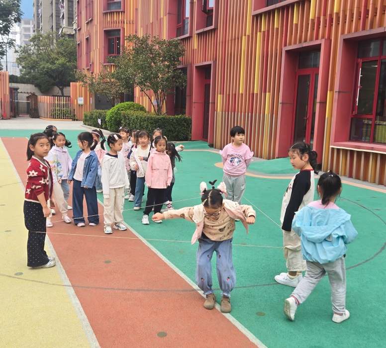 为创新传统体育游戏形式,锻炼幼儿身体平衡与空间感知能力,2025年10月11日,合肥市大西门幼儿园教育集团森林城分园大六班将经典跳皮筋游戏升级,开展了一场妙趣横生的“跳三角形皮筋”健康活动,让孩子们在独特的几何绳阵中体验运动的别样乐趣。