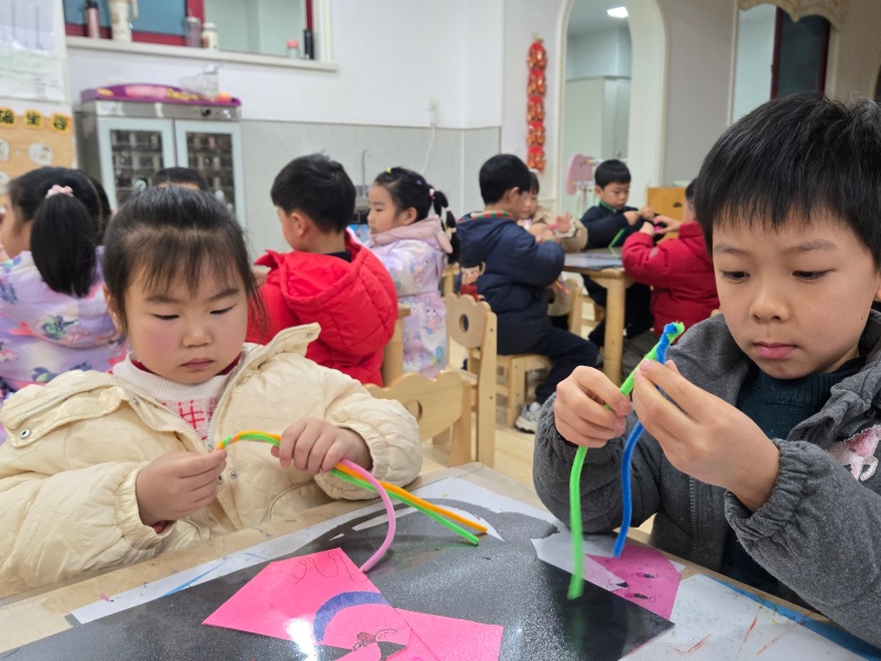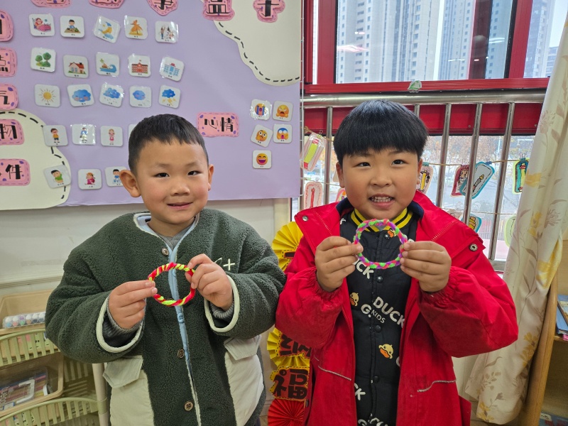 活动中,孩子们专注地拿着红、绿、粉、紫等各色扭扭棒,小手灵活地弯折、缠绕、穿插。有的孩子认真琢磨编织的纹路,有的两两合作互相交流技巧,还有的大胆发挥想象,给手环加上花朵、星星等创意装饰。从最初的生疏尝试,到逐渐掌握编织要领,孩子们的小脸上满是专注与认真,指尖的扭扭棒在他们手中渐渐变成了独一无二的手环。