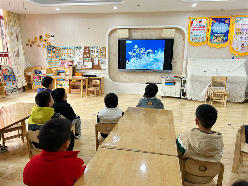 活动伊始,教师通过播放雪景视频、展示雪景图片,引导幼儿观察雪花的形态、颜色以及雪景中房屋、树木、人物的变化,鼓励幼儿大胆分享自己对雪景的感受。