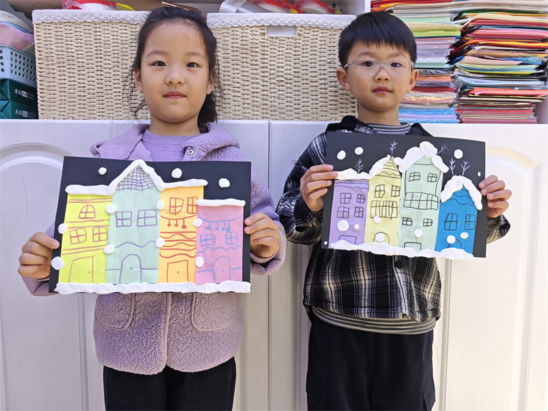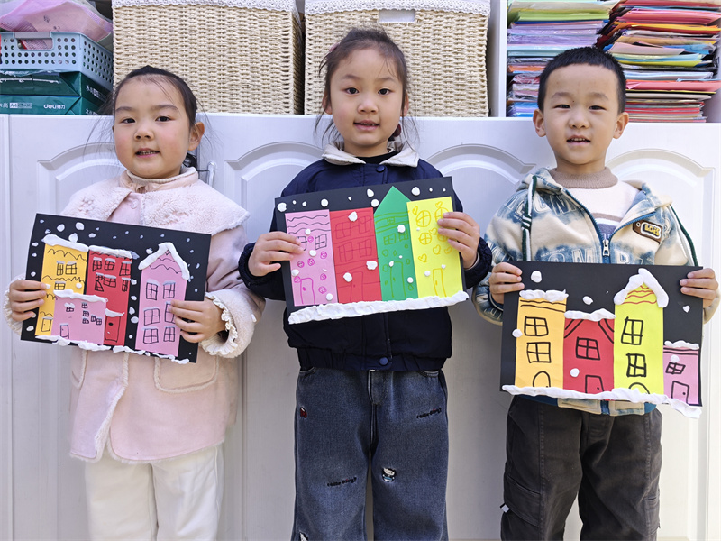 每个孩子都是天生的艺术家,每个儿童都具有创造的潜能和天赋。在此次粘贴画活动中,孩子们通过粘贴、添画等多种形式表现冬天雪景中的房子与景物,动手操作能力以及手部小肌肉的灵活能力都得到了锻炼与提升,幼儿在忘我、投入地涂涂画画、粘粘贴贴中,也在不断丰富着自己的想像力和创造力!