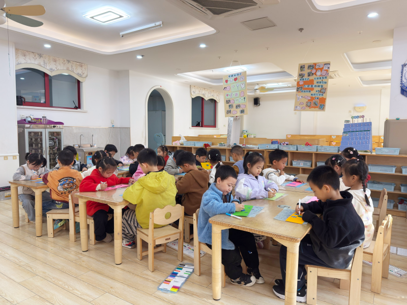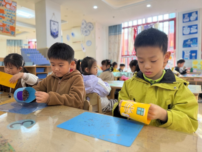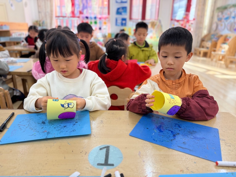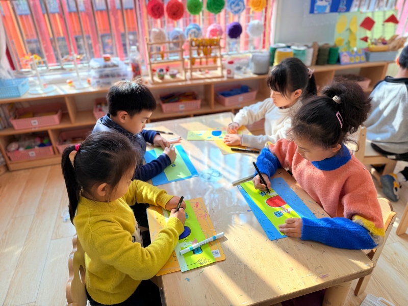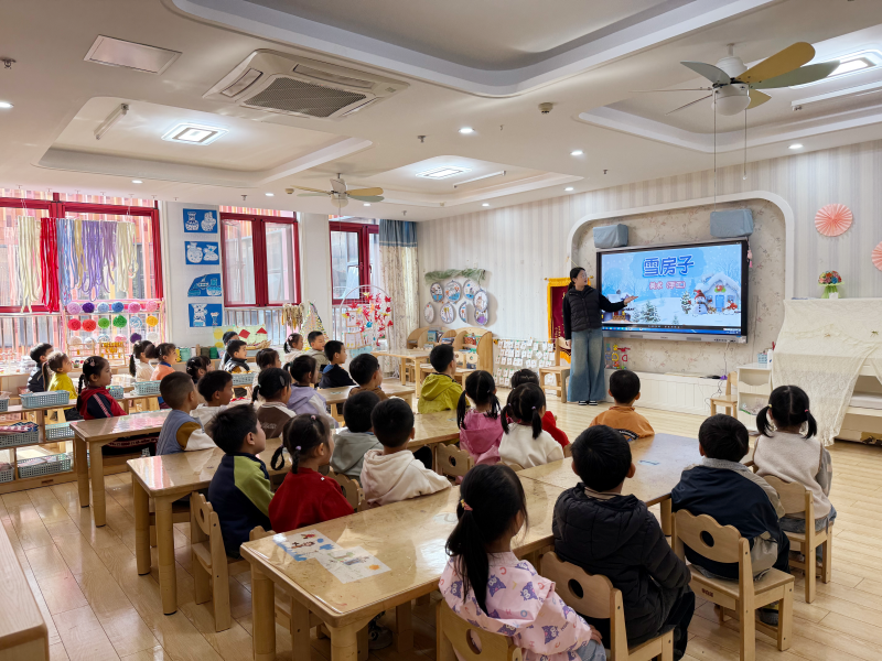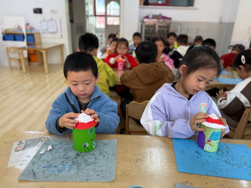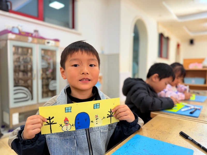 有孩子举着画满雪人的卡纸笑眼弯弯:“我的雪人要和我一样,戴漂亮的帽子!”旁边的小朋友则认真点上几片“雪花”:“冬天的树会掉叶子,雪落在上面特别好看!”