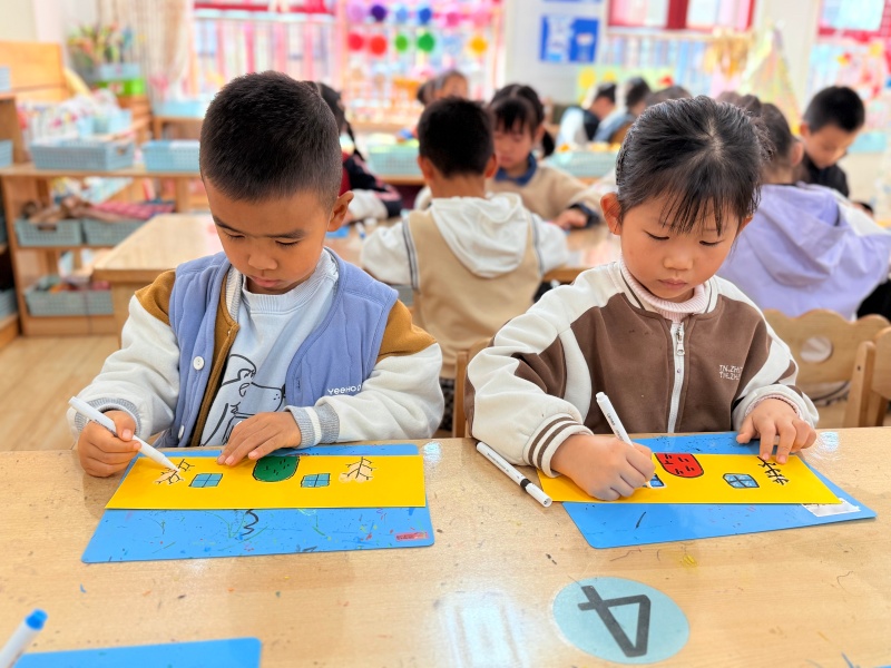 活动伊始,孩子们用彩色卡纸张、水彩笔创作冬日雪景。大家趴在桌前,将对冬天的憧憬绘在纸上:有的给雪人戴上花围巾,有的让小窗透出暖黄灯光,有的在屋角添上落雪的小树。一笔一画里,藏着孩子们眼里最可爱的冬日模样。