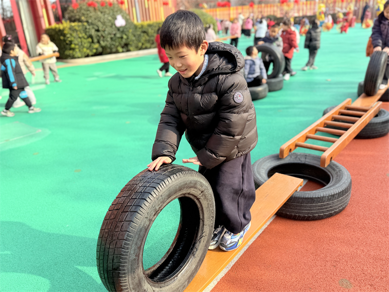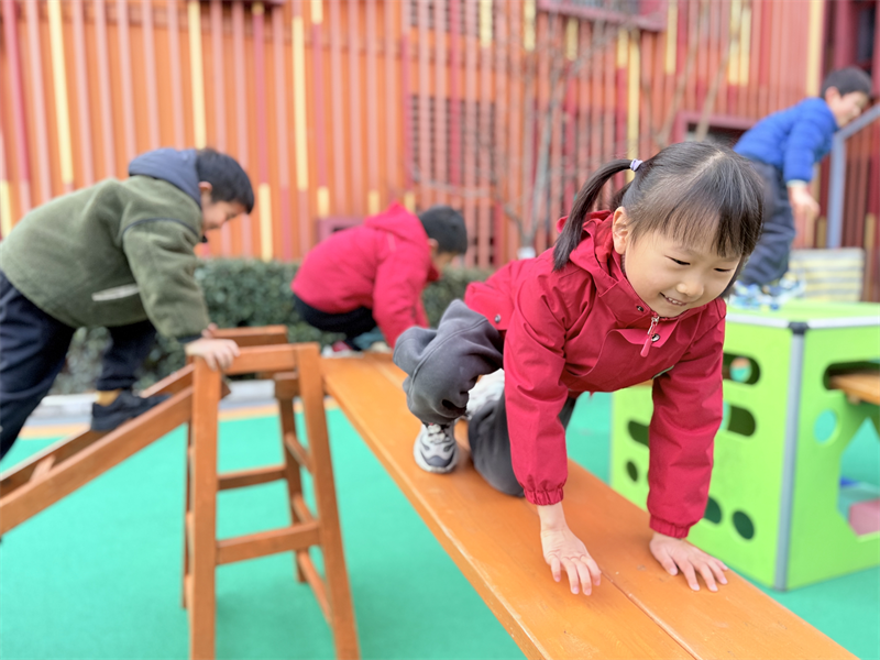 游戏中,孩子们化身“勇敢小探险家”,或攀爬木梯锻炼上肢力量,或稳步走过平衡木提升专注力,或结伴推轮胎培养协作能力。遇到困难时,大家相互鼓励、积极支招,摔倒后迅速爬起继续挑战,尽显不怕困难、勇于拼搏的品质。