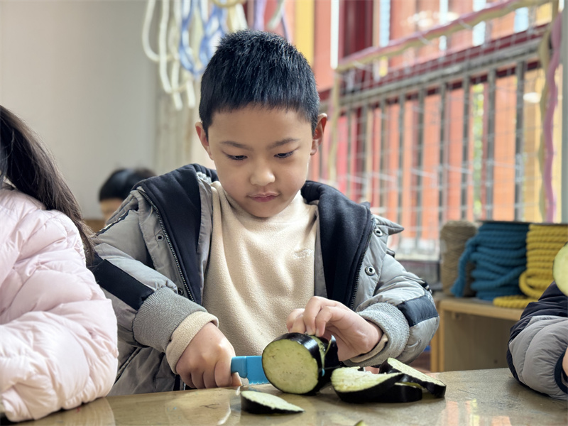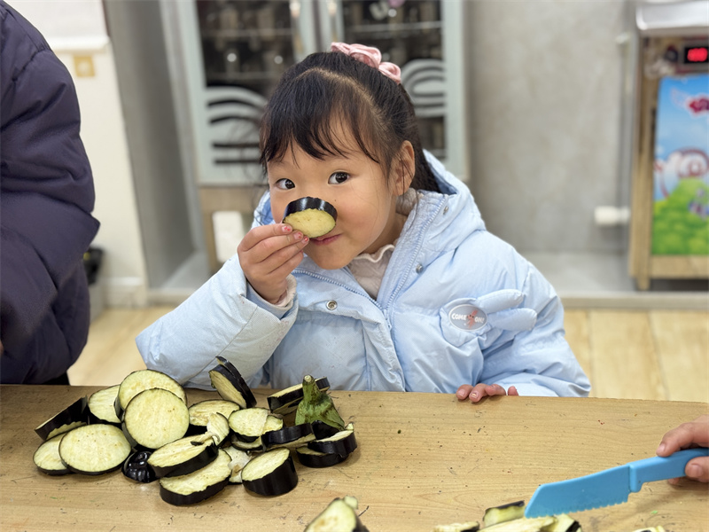 随后,动手切茄子环节成为活动亮点。老师们提前做好安全准备,耐心示范切法,孩子们则在老师的协助下,小心翼翼地将茄子切成均匀的薄片。“看,茄子里面是白色的!”“切开后有小小的籽!”“我闻了一下,像黄瓜的味道!”孩子们一边操作,一边惊叹于茄子内部的构造,切茄子的过程中,手部精细动作与空间感知能力也得到了锻炼。