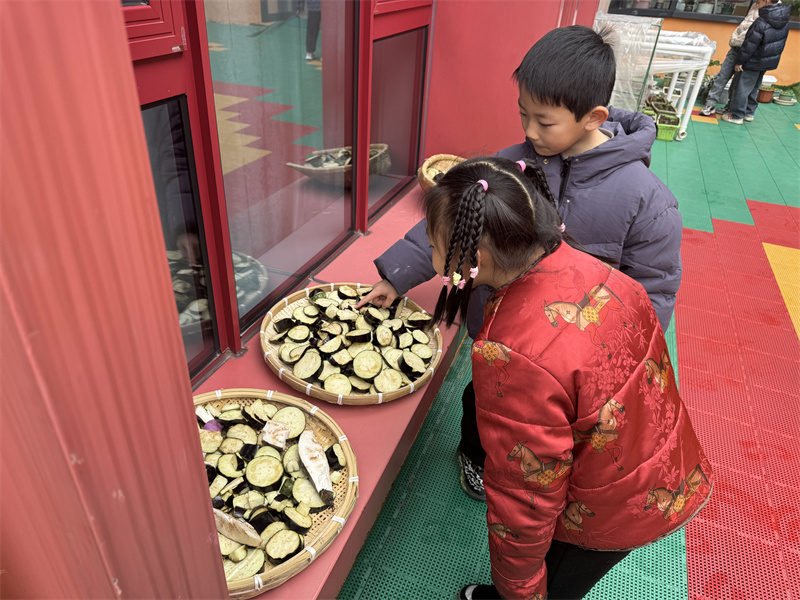 最具意义的当属晾晒茄子。孩子们将切好的茄子片整齐摆在晾晒架上,认真地摆放、整理,还时不时凑近观察,期待着茄子的变化。老师们借此向孩子们讲解晾晒原理,传递“谁知盘中餐,粒粒皆辛苦”的道理,引导幼儿珍惜食物、尊重劳动。