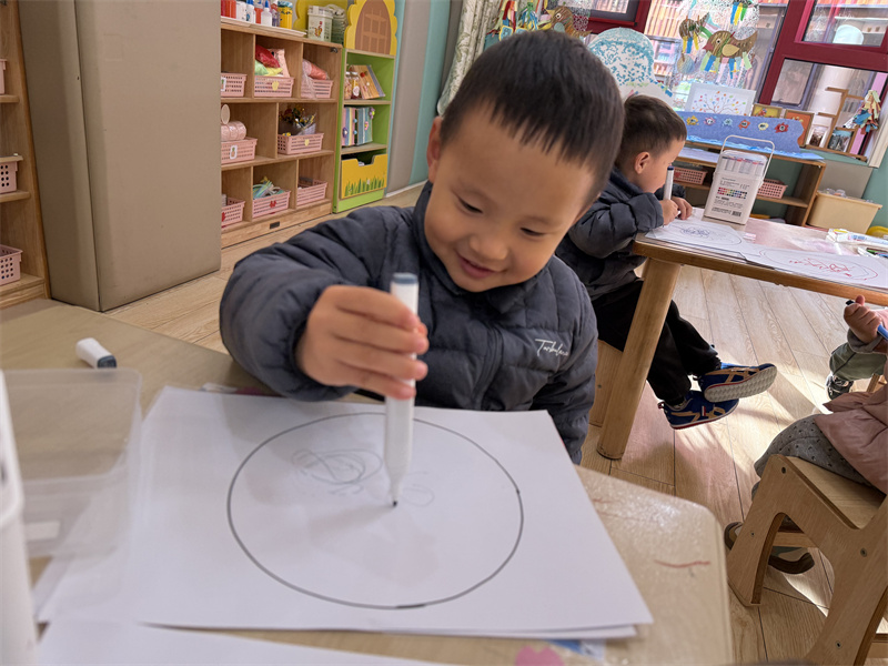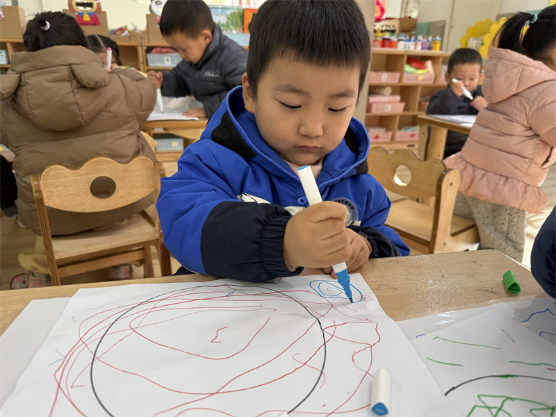 活动现场童趣盎然,老师以“水彩笔宝宝要去跑道跑步”的生动引导,迅速点燃孩子们的参与热情。孩子们手握五颜六色的水彩笔,在画纸上尽情挥洒创意:大大的红色圆圈被解读为“甜甜的苹果”,蓝色螺旋线化身“旋转小风车”,多彩圈圈重叠交织成“彩虹蛋糕”,每一幅作品都充满童真想象。