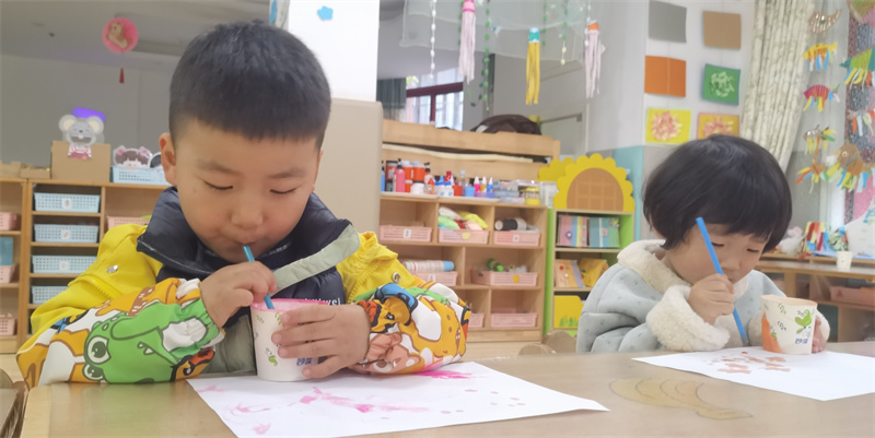 活动伊始,张老师通过生动的水母视频与图片,带领孩子们“潜入”海底世界。孩子们睁着好奇的大眼睛,观察着水母半透明的身体、飘逸的触手,纷纷发出惊叹声。随后,创意创作环节拉开序幕:孩子们先拿起泡泡杯,在画纸上轻轻吹泡泡,将泡泡印当作水母圆滚滚的身体,五彩的印记充满童趣;再用画笔蘸取鲜艳的色彩,自由勾勒水母的触手,有的弯弯绕绕,有的短短细细,每一幅都充满童真。