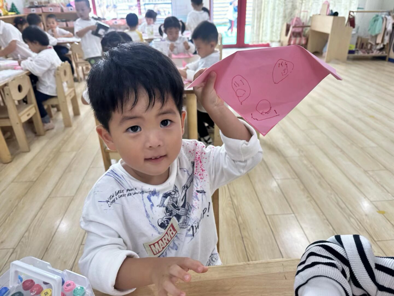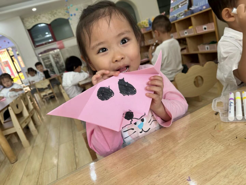在自主创作环节,孩子们迫不及待地拿起彩纸动手尝试。过程中,老师巡回指导,耐心帮助动作较慢的孩子调整折痕,鼓励大胆创意的孩子给小狗贴上“眼睛”“鼻子”贴纸。有的孩子折出了“坐着的小狗”,有的给小狗添上了“花纹尾巴”,教室里满是孩子们的欢声笑语。活动最后,孩子们举起自己的“折纸小狗”向同伴展示,脸上洋溢着自豪的笑容。