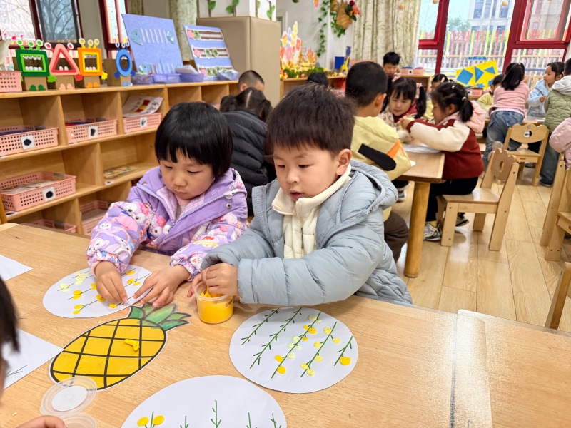 创作过程中,孩子们化身小小艺术家,兴致勃勃地拿起各色粘土,揉、搓、压、捏、粘,小小的手指灵活变换。先取出黄色粘土揉圆压扁,做成圆圆的花瓣;再搓出细长的花茎与绿色的叶子;最后将花瓣、叶子、花茎组合在一起,一朵朵小巧可爱的油菜花便在指尖 “绽放”。有的孩子还发挥创意,为油菜花增添蝴蝶、蜜蜂等粘土小配件,让春日场景更加生动鲜活。教师耐心陪伴在每个孩子身边,温柔指导技巧、及时给予鼓励,让孩子们在创作中收获自信与快乐。