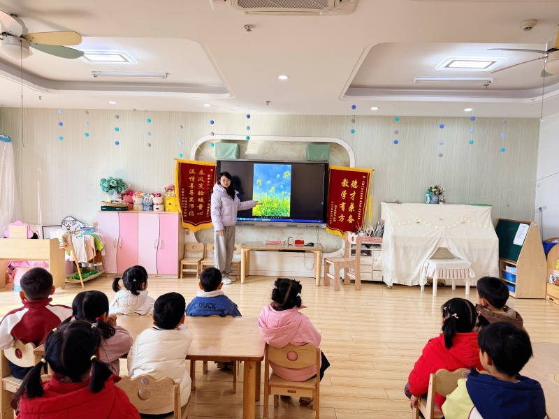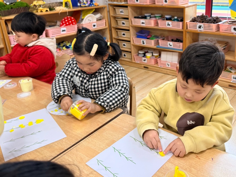 活动伊始,教师通过播放油菜花田实景视频、展示精美图片,引导幼儿观察油菜花的形态特征:金黄的花瓣呈十字形,簇拥在绿色的花茎顶端,远远望去像一片金色的海洋。孩子们睁着好奇的大眼睛,纷纷分享自己的发现:“老师,油菜花是黄色的,有四片花瓣!”“它的叶子长长的、绿绿的!” 生动直观的体验,为孩子们的创作奠定了基础。