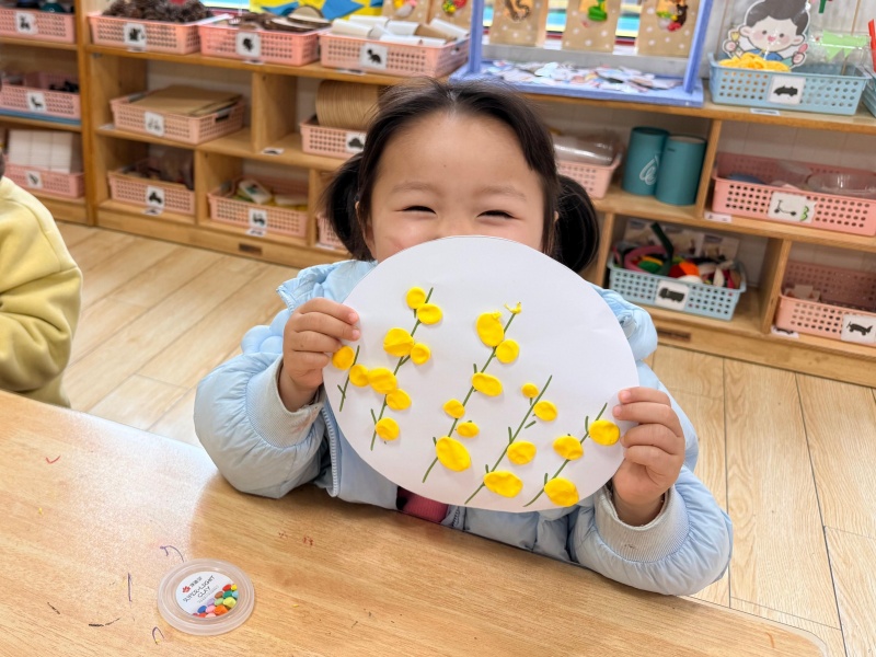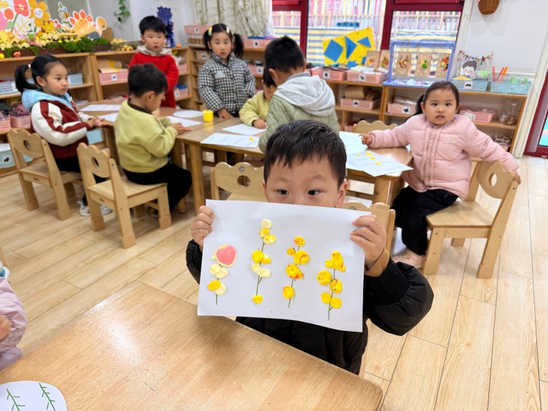 活动结束后,孩子们举着自己的作品互相欣赏,兴奋地分享创作心得:“这是我做的油菜花,送给妈妈!”“我的油菜花田,有好多小蜜蜂来采蜜啦!” 一张张稚嫩的脸庞洋溢着满足的笑容,一件件充满童趣的作品,展现着孩子们对春天的理解与想象。