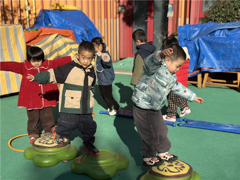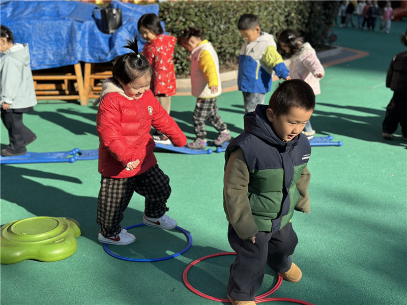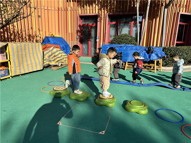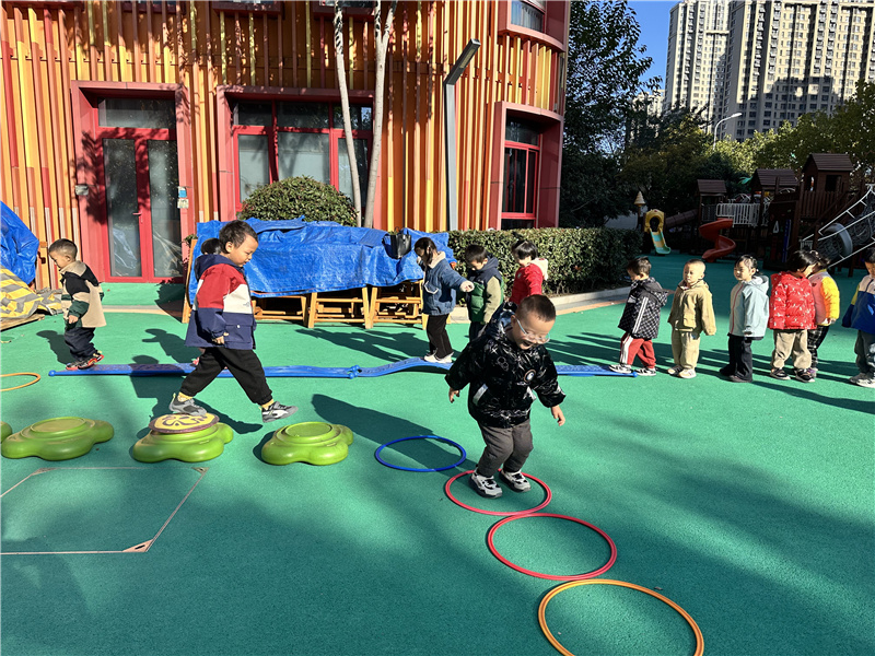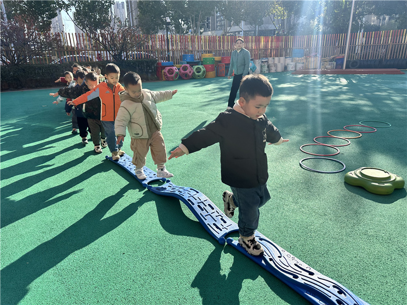 蓝色平衡木上,孩子们伸展双臂,努力保持平衡,从最初的踉跄轻晃逐渐过渡到稳健前行;梅花桩间,萌娃们踮起脚尖,跳跃自如,神情专注且认真;彩色圆环路径中,身影穿梭其间,欢笑声此起彼伏。老师在旁轻声引导,及时给予鼓励,用温柔的关怀守护着孩子们每一次勇敢的尝试。