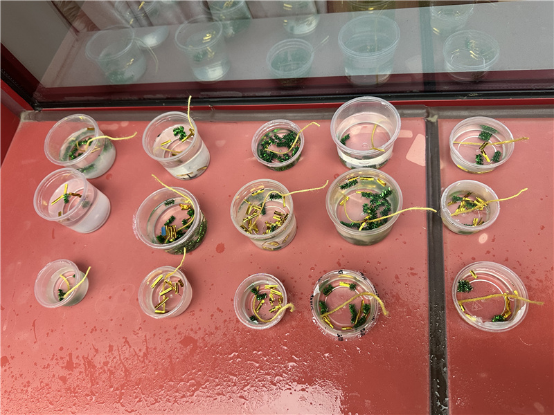 活动前,老师带着孩子们一起准备材料。大家把扭扭棒做成可爱的造型,放进透明的小杯子里,再加入清水。孩子们小心翼翼地把杯子摆在室外,期待着一场神奇的“魔法”发生。