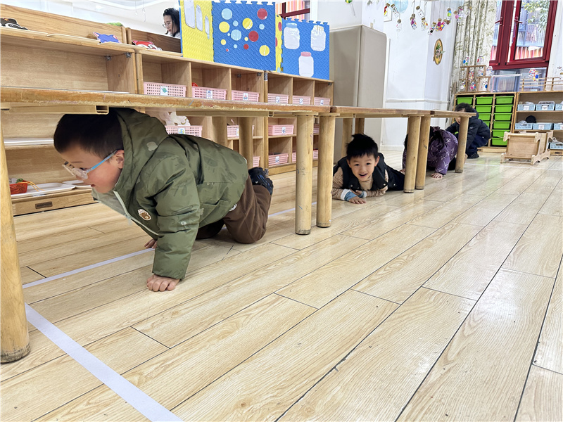 活动伊始,老师们巧妙利用教具创设游戏情境:小椅子变身为“平衡木”,孩子们化身“小小冒险家”,展开双臂,稳步前行,目光中满是对挑战的专注与勇气。随后的“桌下寻宝”游戏更是点燃了全场热情——孩子们灵巧地钻爬前进,沿着地面路线“探险”,时而与同伴默契比拼,时而为发现“宝藏”击掌欢呼,教室里荡漾着纯真的笑声。