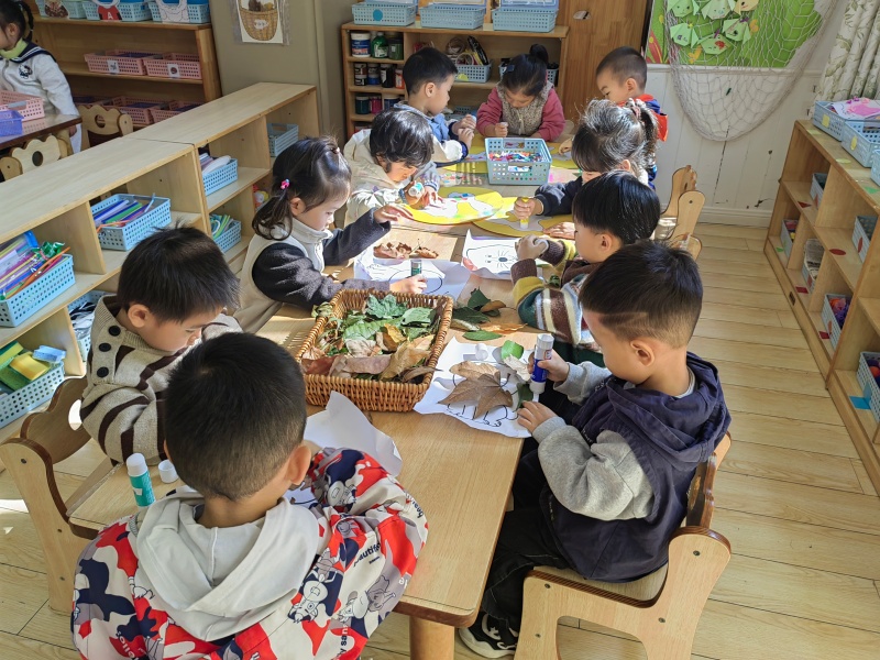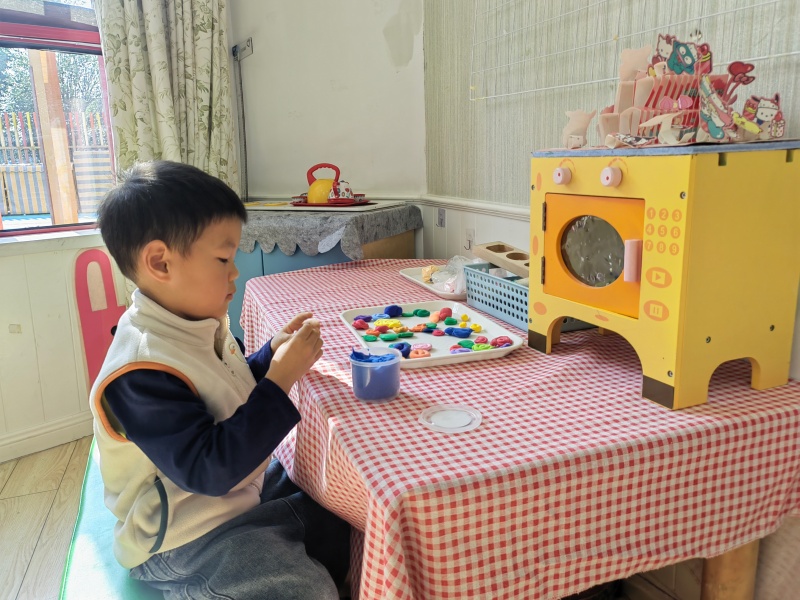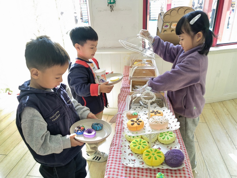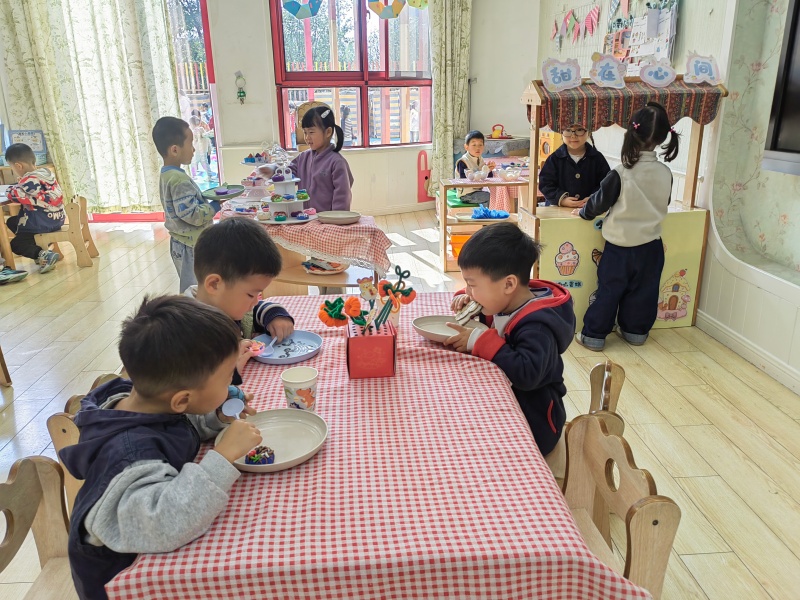 各个区域都洋溢着孩子们的欢声笑语。孩子们在甜蜜甜品店仿真的社会环境中,在游戏中体会社会生活,进行社会实践。小厨师们围在操作台前,小心翼翼地用彩泥捏出圆滚滚的饼干、甜点,认真地完成属于自己的“招牌甜品”;做好的甜品被端上柜台,“服务员”立刻挺直小身板,用稚嫩的声音问:“小顾客,你要草莓口味的还是巧克力口味的呀?”“小顾客”仔细挑选后扫码支付,还会奶声奶气地说“谢谢”,和好朋友一起在餐桌上品尝甜品,孩子们在互动中学会了表达与分享。美工区里,孩子们化身“小艺术家”,指尖的创意不停迸发。秋日里掉落的银杏叶、枫叶,在纸上拼贴,一只憨态可掬的“狮子”便跃然纸上,每一幅作品都藏着孩子们对世界的美好想象。益智区里,思维的火花正在悄悄绽放。孩子们围坐在拼图前,你找边角、我拼中间;还有的孩子专注地摆弄串珠,一边数着珠子的数量,在游戏中不知不觉锻炼了观察力、逻辑思维与手眼协调能力。