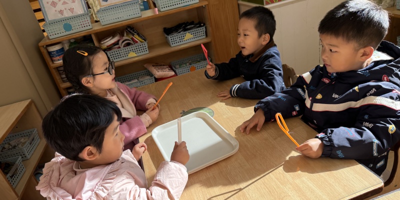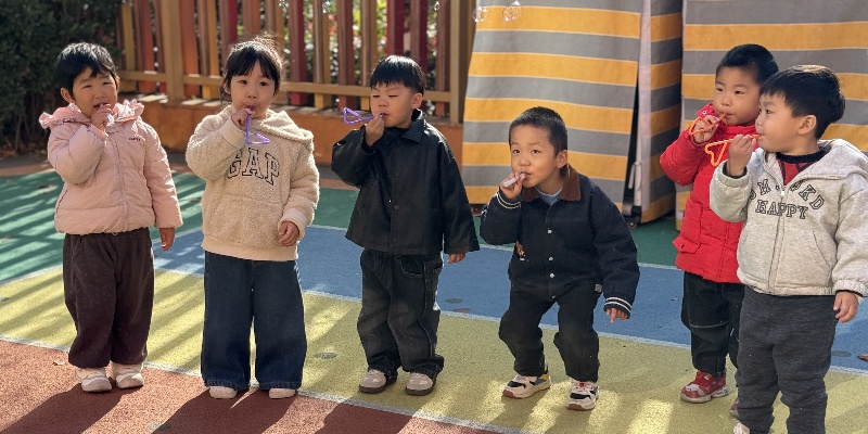 “现在轮到小朋友们当泡泡魔法师啦!”老师为孩子们分发了安全的泡泡水和小吸管,带着大家来到户外。孩子们迫不及待地拿起工具,学着老师的样子轻轻吹气,有的小朋友吹出了一串串小泡泡,像晶莹的珍珠;有的小朋友吹出了一个大大的泡泡,像圆圆的气球。“我的泡泡飞到树上啦!”“泡泡碰到我的小手就不见了!”“我们的泡泡抱在一起啦!”孩子们奔跑着、欢呼着,追逐着漫天飞舞的泡泡,感受着泡泡飞起、飘落、破裂的过程。老师适时引导:“吹泡泡的时候,轻轻吹和用力吹,泡泡有什么不一样呀?”孩子们尝试后发现:“轻轻吹,泡泡大大的;用力吹,泡泡小小的,还会破!”活动中,有的小朋友不小心把泡泡水洒在了地上,惊喜地发现:“地上的泡泡水也能吹出小泡泡!”大家纷纷模仿,在探索中发现更多关于泡泡的乐趣。