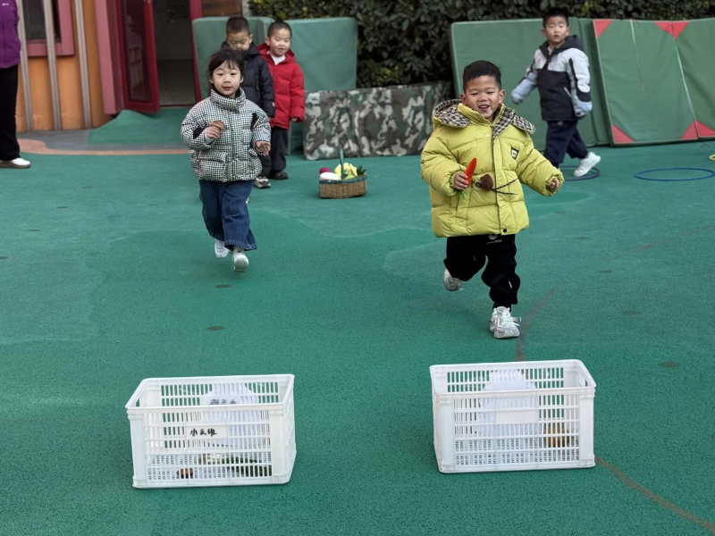 活动伊始,黄老师化身“兔妈妈”,带领孩子们开展全方位热身运动,从头部转动到上肢伸展、下肢屈伸,充分激活身体机能,为后续运动筑牢安全基础。随后,四大趣味游戏区循环挑战正式开启,孩子们变身“小兔”,依次完成直线跑运西瓜、S弯跑穿树林、绕障碍跑跨小河、折线跑送蔬菜等任务,在沉浸式游戏中锻炼了平衡能力、协调能力与耐力,每一次成功挑战都让孩子们收获满满的成就感与满足感。
