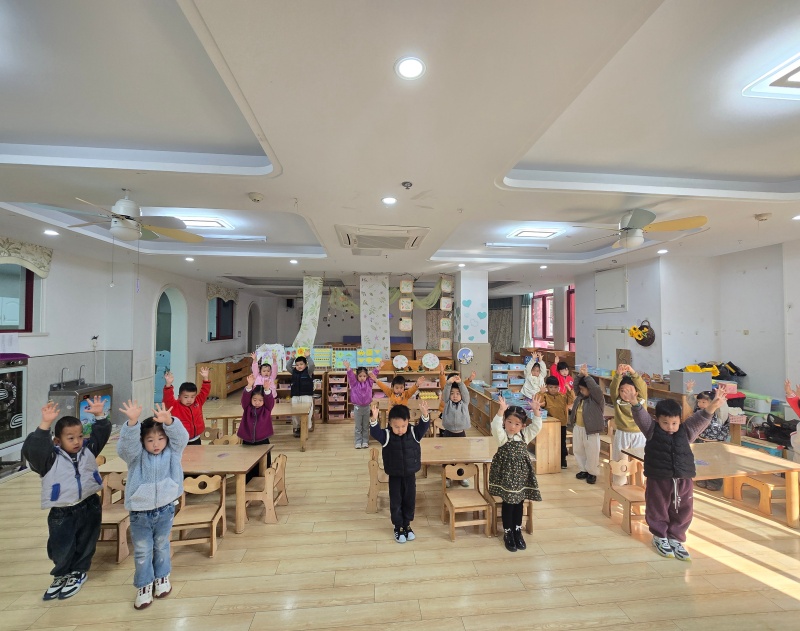 “拍手拍手拍拍手,跺脚跺脚跺跺脚!”在“节奏小玩家”活动现场,教师以《幸福拍手歌》《合拢放开》等经典儿歌为载体,引导孩子们探索身体“乐器”。孩子们跟着旋律拍手、跺脚、点头、拍肩,用稚嫩的动作回应节奏变化。随后的“声音模仿秀”环节,教师模仿雨滴“滴答”、小鼓“咚咚”的声音,孩子们争相模仿,在互动中感知快慢、强弱的节奏差异。趣味十足的身体律动让孩子们沉浸其中,教室里满是欢快的节拍与笑声。