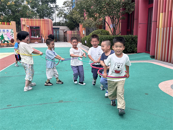 操场上,小萌娃们化身“创意玩家”,把简单的圈圈玩出了花样:有的手拉手将圈圈稳稳套在腰间,变身一列列“小火车”,“车头”带队、“车厢”紧跟,小脚步声整齐又响亮,在协作里感受团队的温暖;有的把圈圈排成弯弯的“小河道”,双脚交替蹦跳着跨过,像只灵活的小兔子,小脸上满是雀跃,肢体协调性在蹦跳间悄悄提升;还有的双手握圈,轻轻一推让圈圈咕噜噜滚起来,玩起“风火轮”游戏,眼睛追着圈圈转,专注又认真。