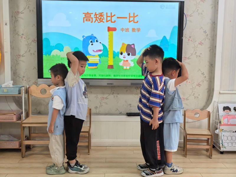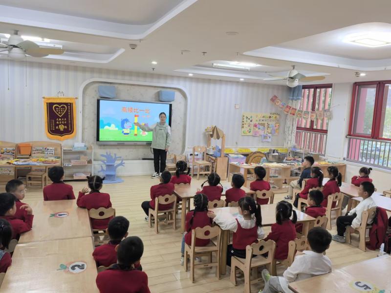 活动伊始,老师通过生动的动画故事《河马和小猫咪》导入,引发孩子们对“谁高谁矮”的讨论兴趣。随后,一系列趣味游戏轮番展开:“伙伴比身高”环节,孩子们两两结对,背靠背站直,用小手比划着彼此的头顶,清晰地判断出谁高谁矮;“积木叠叠乐”中,大家用不同长度的积木搭建“高塔”,在比较谁的塔更高的过程中,学会了通过统一底部基准来判断高矮;最受欢迎的“教室寻宝”游戏,孩子们需找出教室里“最高的物品”和“较矮的物品”,从测量柜子高度到比对书架层数,将高矮比较自然融入对周围环境的探索中。