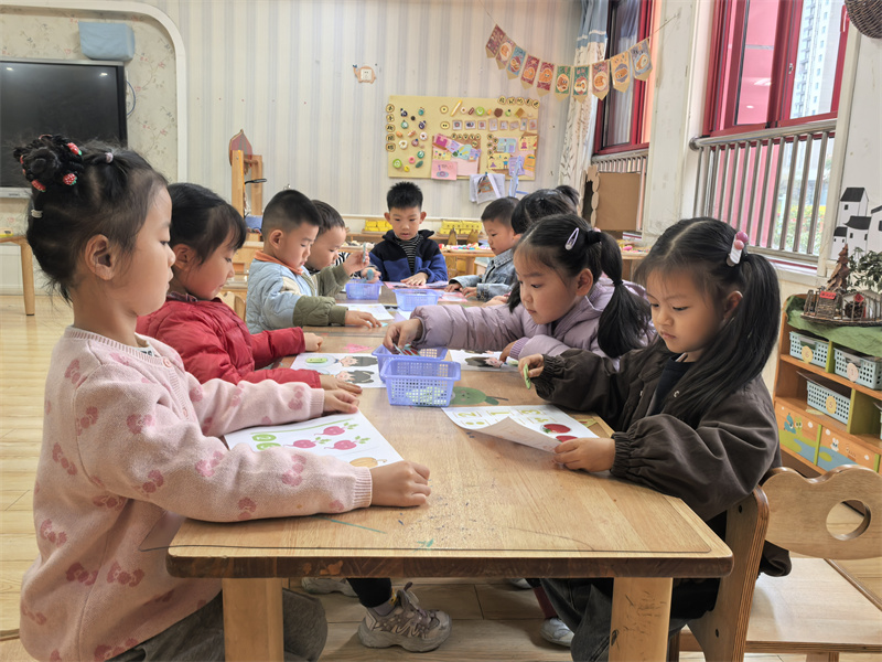 为此,老师设计了“蔬果卡片点数游戏”:将色彩鲜艳的水果、蔬菜卡片摆放在游戏图上,引导孩子们用小手逐一点数卡片数量,在“指一个、数一个”的操作中,建立数字与实物的对应联系,逐步掌握“一一对应”的点数方法。