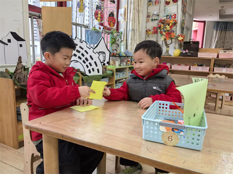 活动中,老师用情景表演、绘本故事,告诉孩子们“遇到困难不用怕,朋友帮忙力量大”。游戏环节里,孩子们纷纷当起“小帮手”:有的整理散落的玩具,有的帮同伴穿外套扣纽扣,还有的在美工区分享工具、教折纸技巧。看到同伴露出笑容,小帮手们笑着说:“帮朋友真开心!”