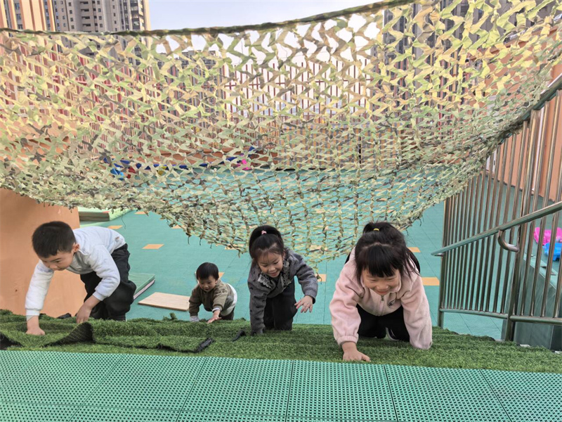 活动前,老师提前排查场地安全隐患,讲解游戏规则与自我保护要点,引导幼儿做好热身运动。游戏中,迷彩网下孩子们化身勇敢小战士,有的手脚并用地匍匐前进,有的灵活穿梭在障碍道具间,还有的小组协作完成攻防任务,不仅锻炼了跑、跳、钻、爬等动作技能,还学会了倾听指令、互助配合,现场欢声笑语不断。