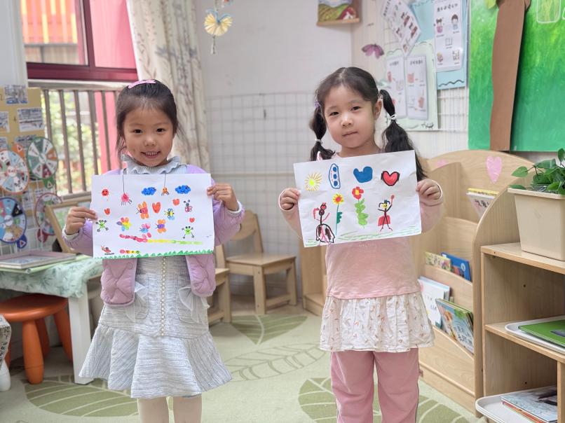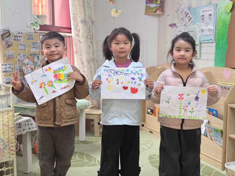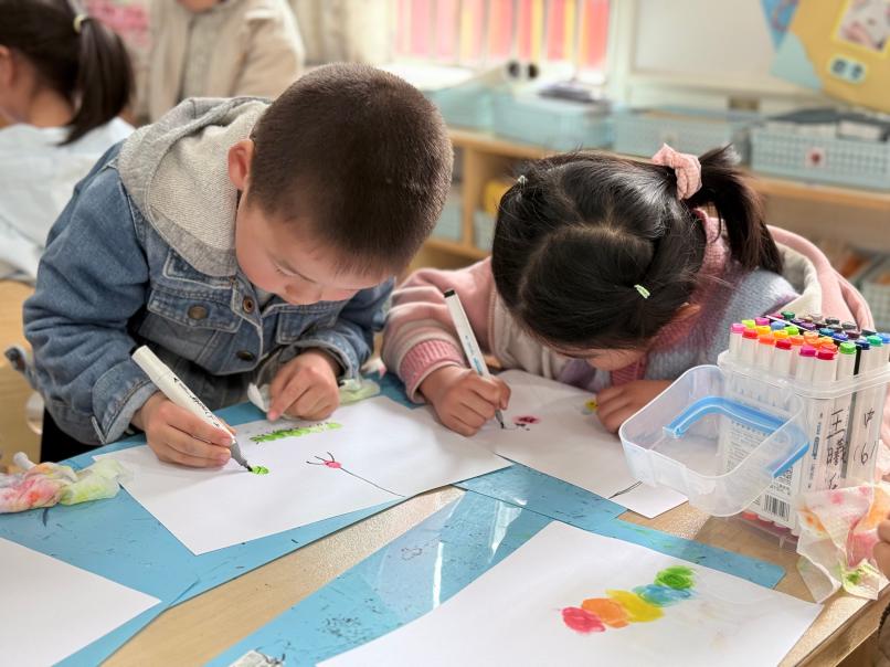 活动中,五彩的颜料如同春日里的繁花,吸引着孩子们好奇的目光。在老师的引导下,他们伸出小手指,轻轻蘸取喜爱的色彩,小心翼翼地印在画纸上,一个个圆润可爱的指印便跃然纸上。随后,孩子们充分发挥想象力,用画笔添上触角、眼睛、四肢与花纹:绿色指印连成蠕动的毛毛虫,红色指印化作带斑点的小瓢虫,彩色指印堆叠成彩虹色的小花,每一幅作品都充满了童真与生机。