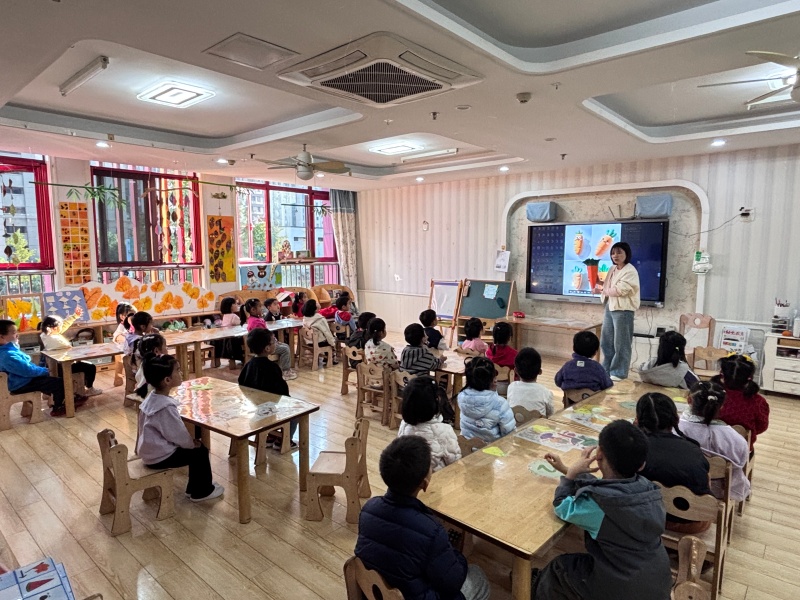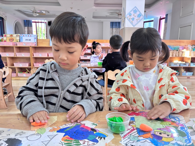 孩子们早已跃跃欲试,领取粘土材料后,立刻投入到创作中。大家专注地揉着粘土,有的小心翼翼地将橙红色粘土搓成圆锥形,有的认真调整绿色菜叶的长短搭配,还有的发挥想象力,给胡萝卜添上可爱的“小表情”。过程中,老师巡回指导,鼓励孩子们大胆尝试,耐心解答大家的疑问。遇到困难时,小朋友们还会互相帮忙,分享自己的小技巧,课堂氛围温馨又热闹。