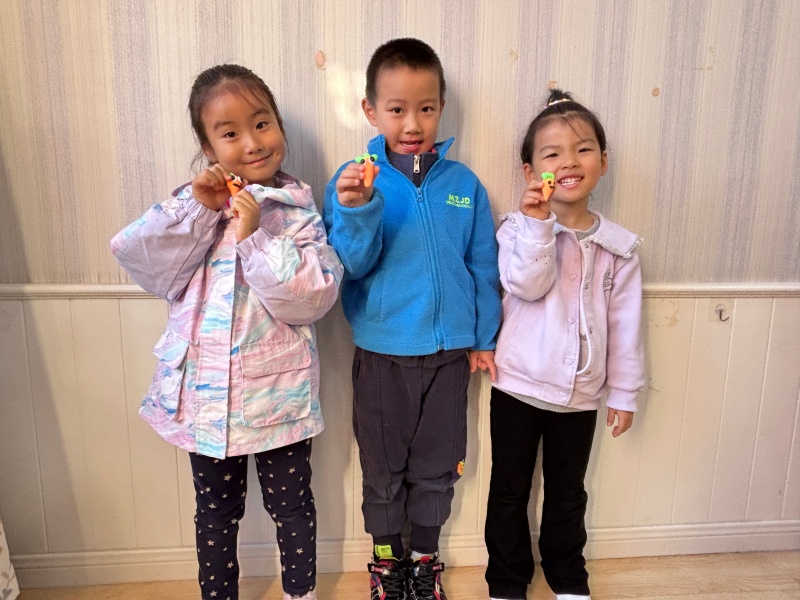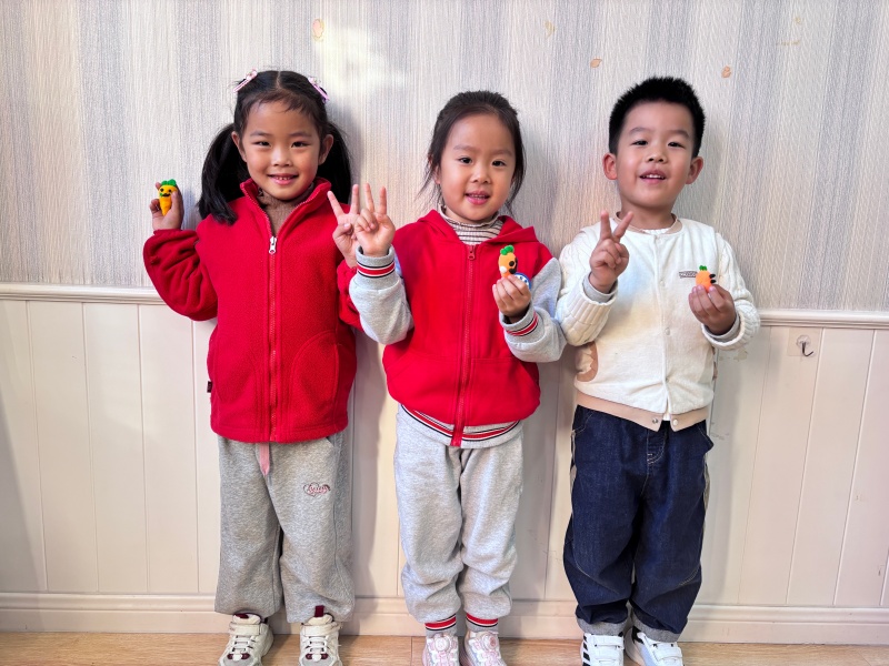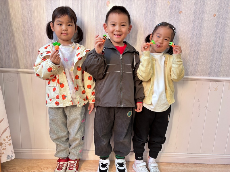 经过一番精心创作,一根根形态各异、色彩鲜艳的粘土胡萝卜新鲜“出炉”:有的胖乎乎憨态可掬,有的细长挺拔,还有的带着几片翠绿的菜叶,显得格外逼真。孩子们捧着自己的作品,脸上洋溢着自豪的笑容,纷纷向老师和同伴展示、分享,教室里充满了欢声笑语。