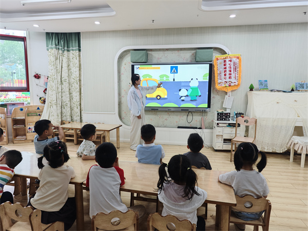 活动伊始,老师引导孩子们分享自己见过的交通标志,小朋友们纷纷踊跃发言。随后,通过对比“无序的交通”组图,孩子们直观感受到交通标志的重要性,意识到遵守交通规则的必要性。在认识交通标志环节,老师借助“生活中常见的交通标志”组图,详细介绍了指示标志、禁令标志和警告标志。孩子们聚精会神,积极回应老师的提问。