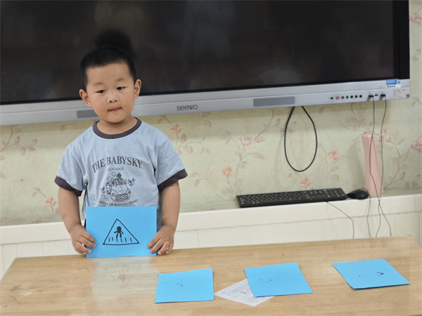 为了加深印象,老师组织了有趣的游戏。在“掏宝”游戏中,孩子们分组摸卡片、说标志名称,现场气氛热烈。模拟过马路游戏里,孩子们化身“小行人”,认真观察标志、遵守规则,玩得不亦乐乎。