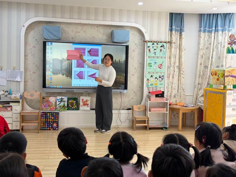 活动伊始,老师精心准备了五颜六色的彩纸,先用生动有趣的语言向孩子们介绍了纸飞机的由来,再通过一步步细致演示,展开折纸教学。老师放慢动作,耐心讲解每一个折叠步骤:对角对齐、翻折机翼、整理机身,从简单的对折到巧妙的造型调整,手把手引导孩子们掌握折纸技巧,同时提醒孩子们注意纸张对齐、边角平整,帮助孩子们克服折叠过程中遇到的小困难。孩子们个个睁着好奇的大眼睛,目不转睛地看着老师的示范,小脑袋跟着思考,小手指也跃跃欲试。