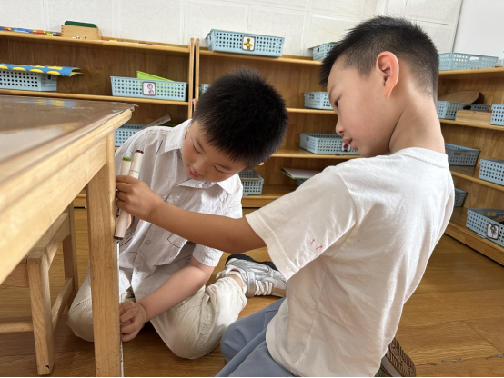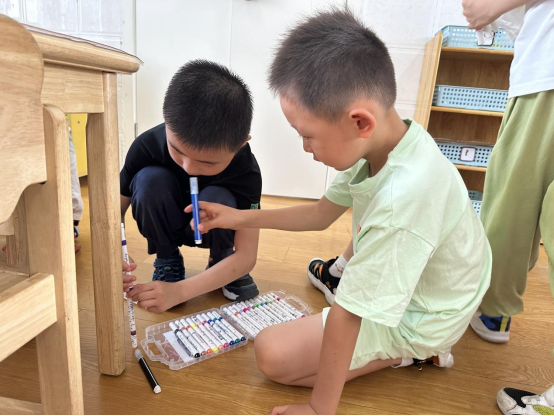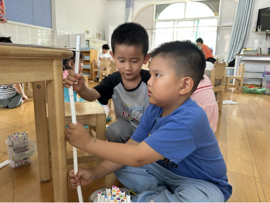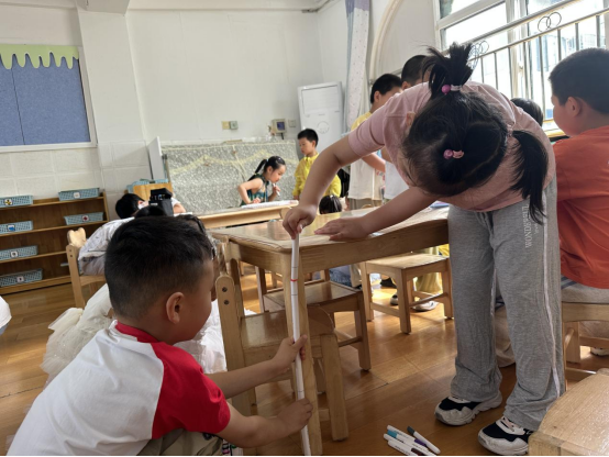 在开展“有趣的测量”这一活动时,孩子们对于“量一量”都表现出极大的兴趣,幼儿阶段的测量不是使用标准量具和计量单位进行的测量,而是以自然物作为工具的自然测量,孩子们使用相同长度的记号笔来测量桌子的高度,通过实物的操作,幼儿直观地了解了“首尾相接”就是将测量工具一个接一个,头尾接在一起,不留缝隙地进行测量。