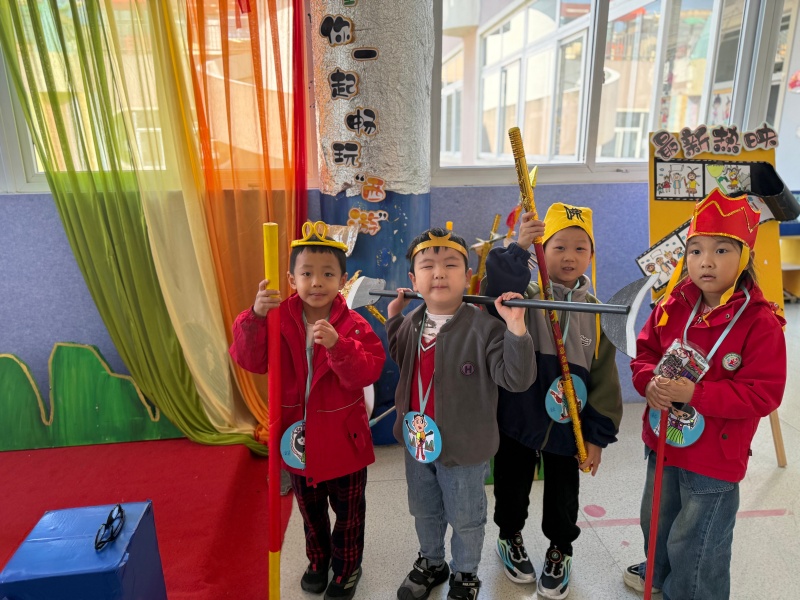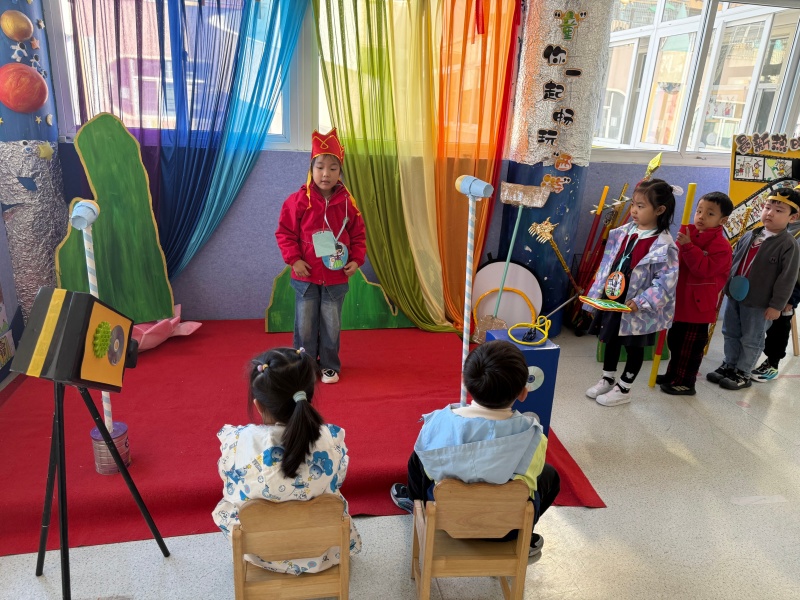 近日,大二班教室的区域游戏区里热闹非凡,一场以“西游记”为主题的趣味游戏盛宴正精彩上演。 在表演区,孩子们化身“西游小分队”:头戴自制紧箍咒、僧帽的“师徒四人”,手持金箍棒、钉耙等道具,在彩虹幕布前模仿剧情对话,台下小观众们看得目不转睛,沉浸式体验经典故事的魅力。